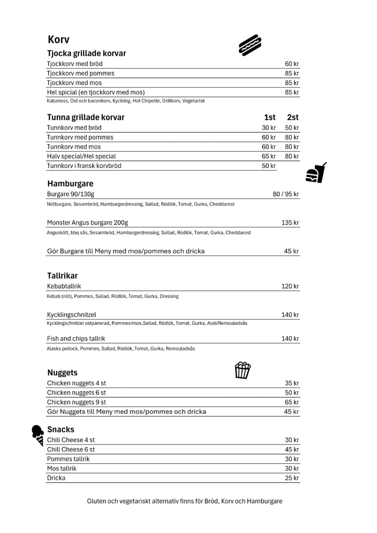 Sugen på mer, då kan ni besöka vår grill där ni kan få hamburgare och korv med pommes/mos.
